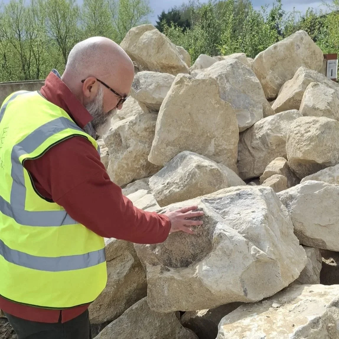 Each boulder was approached individually. We walked around them, considered their proportions, their faces, the way they might sit within the landscape. Some were dismissed immediately. Others held our attention a little longer. The aim is never simply to choose something that looks impressive in isolation, but to find stones that will contribute meaningfully to the composition of the garden.
