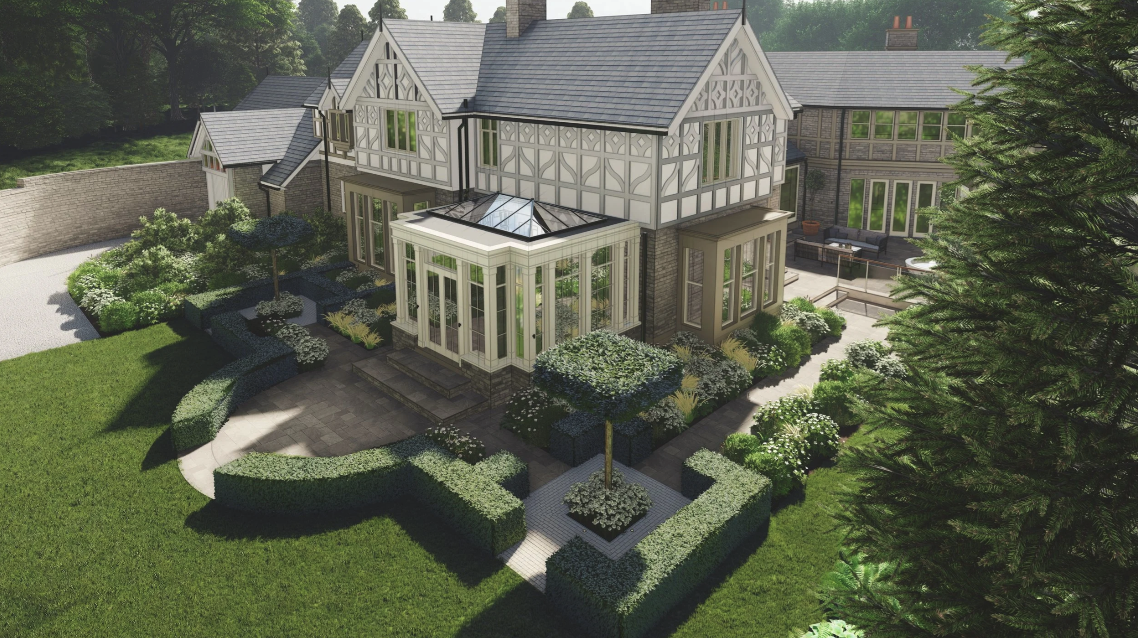 A visual from one of our projects showcasing a formal garden that gracefully wraps around the house, creating a sense of elegance and grandeur in harmony with the architecture.