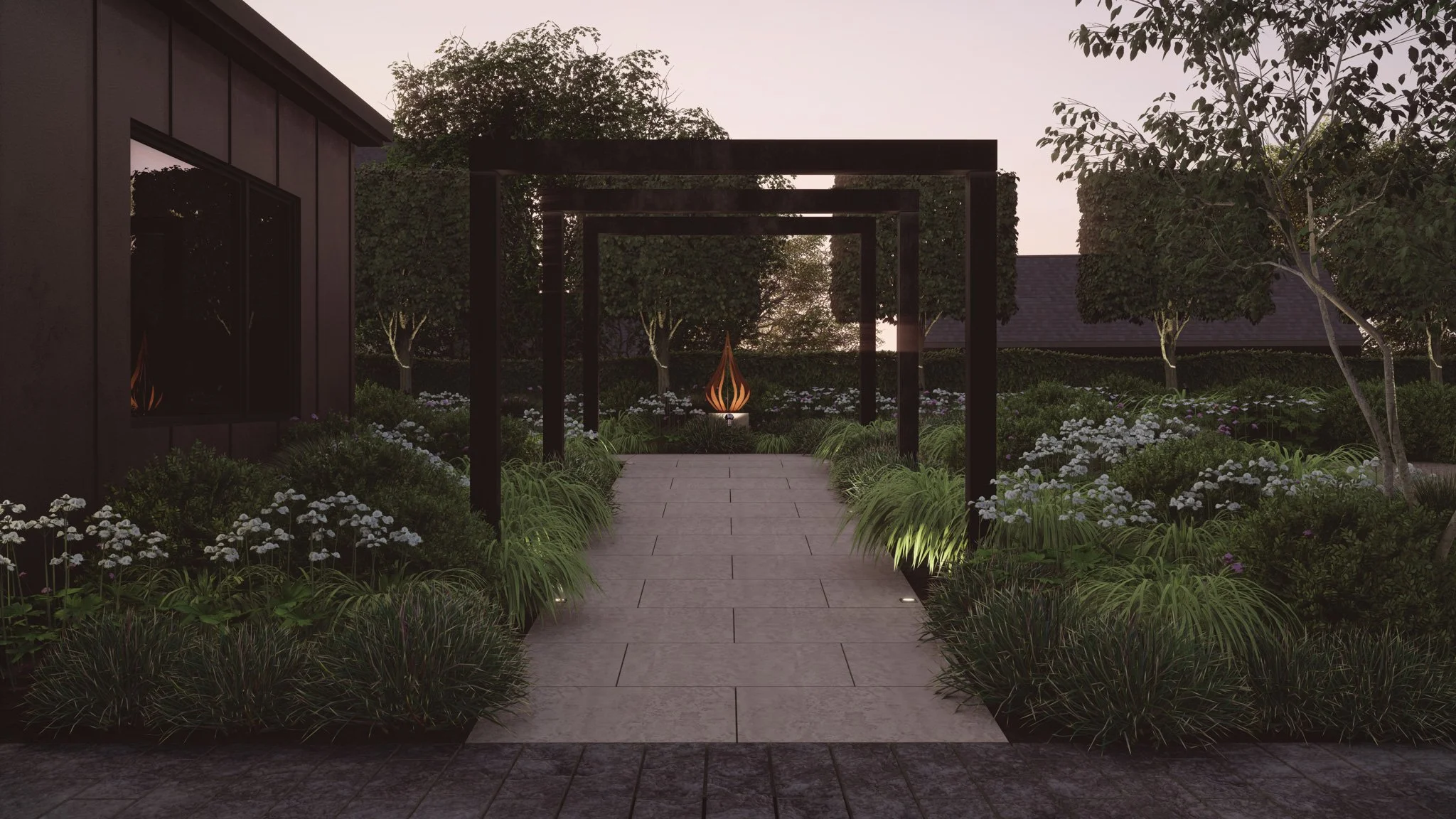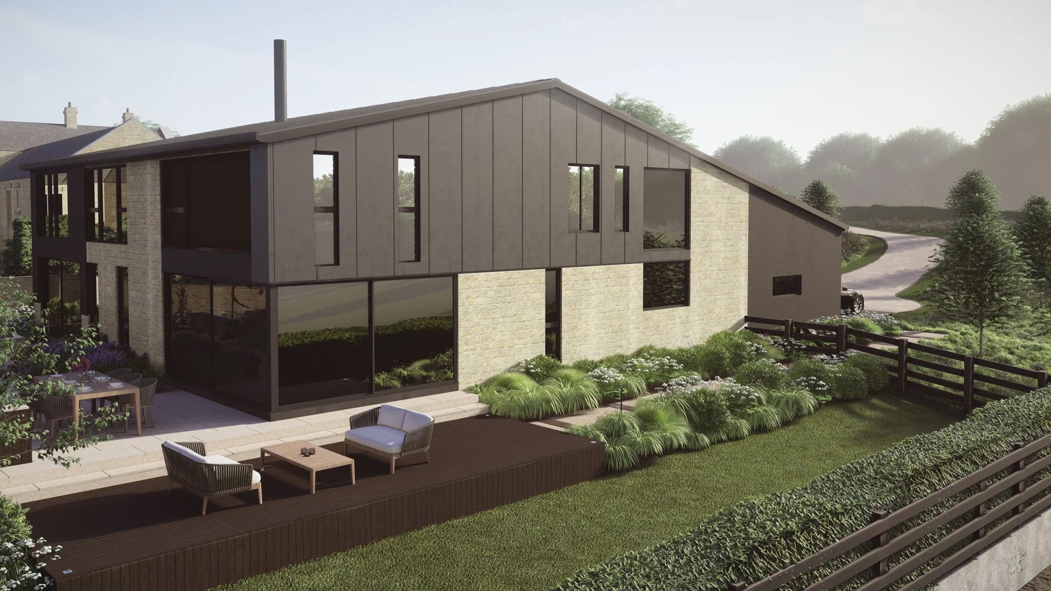 The minimalist planting complements the house with its gorgeous Yorkshire sandstone, which creates a striking contrast with the black metalwork and timber.